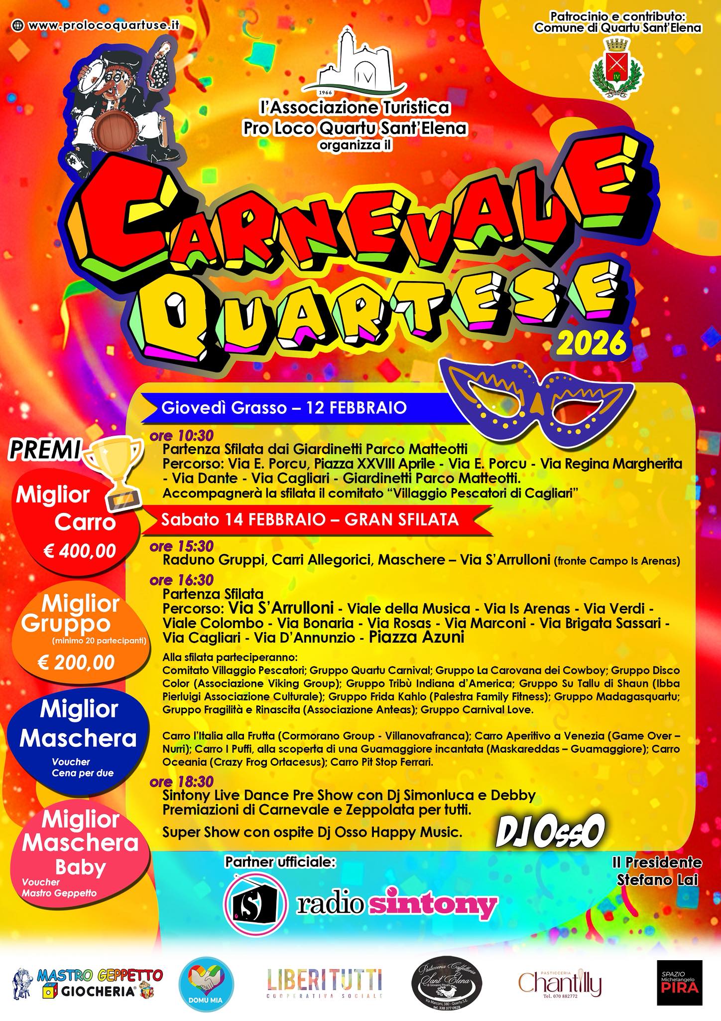 Al via il Carnevale Quartese 2026, un’esplosione di allegria, musica e colori. Preparati per un Carnevale indimenticabile!