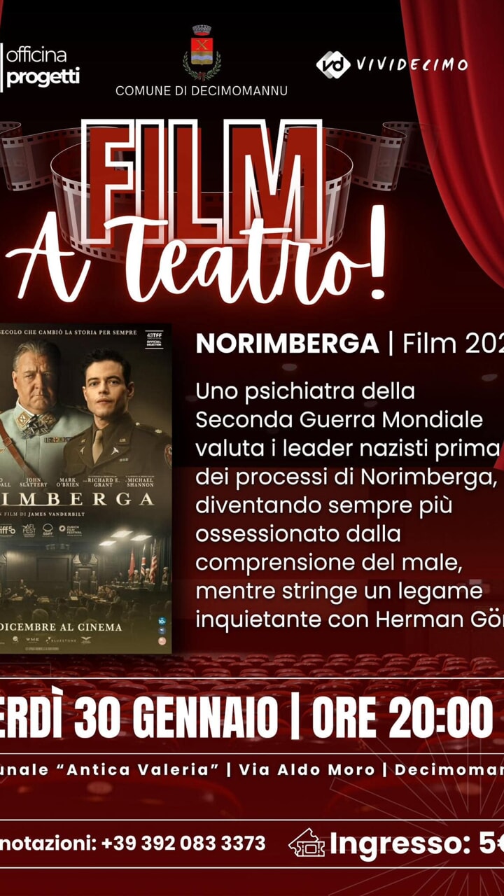 Segnalati Gennaio 30 A Decimomannu arriva “Norimberga” al Teatro Antica Valeria Decimomannu La rassegna “Film a Teatro!” entra nel cuore della programmazione invernale con un appuntamento di alto profilo culturale…