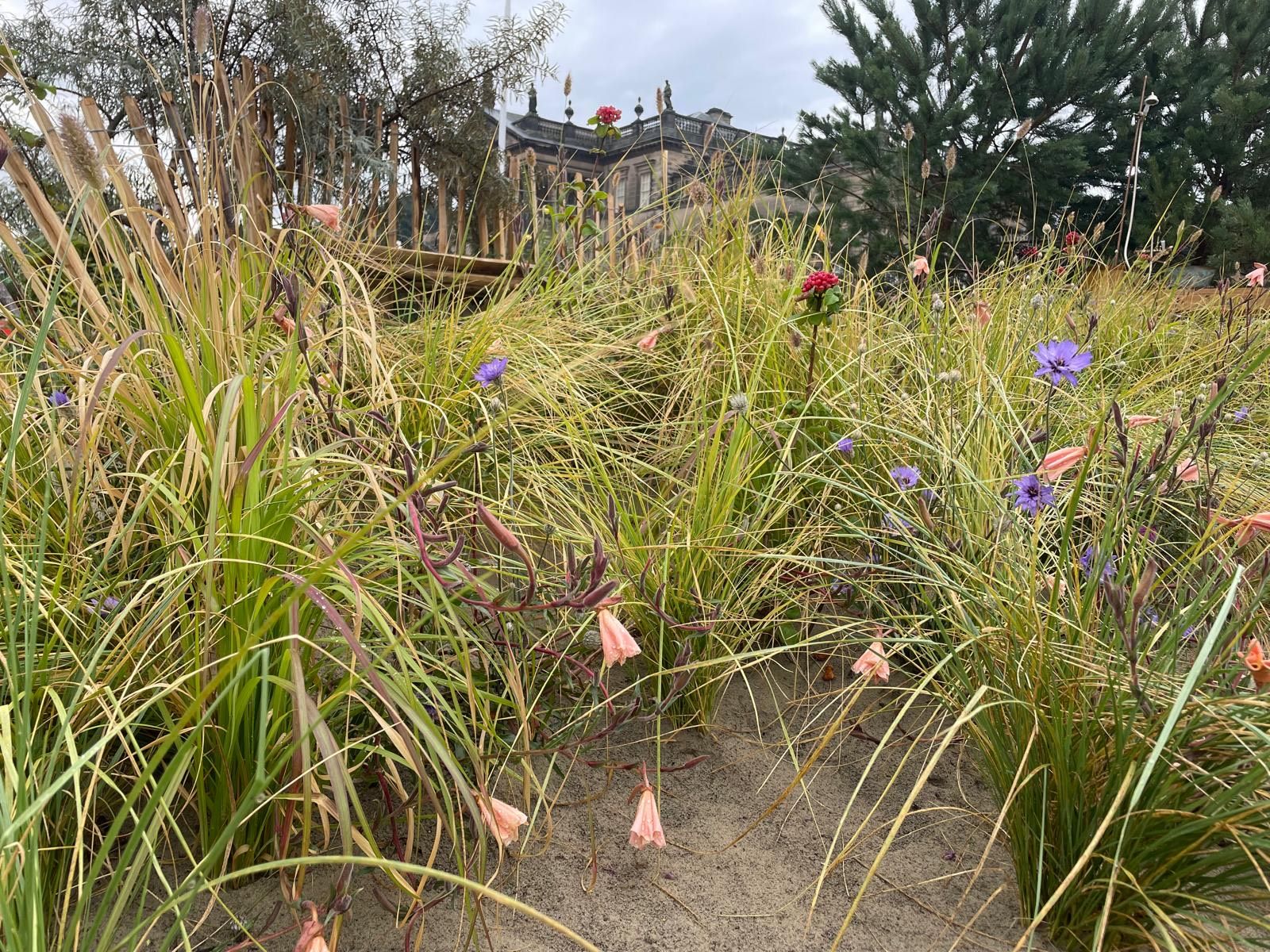 “Dune Garden” è un paesaggio dunale senza confini, dove erbe morbide, rose selvatiche, primule e cardi convivono accanto a pini e ginepri. L’allestimento, presentato al Flower Show di Wentworth Woodhouse in Inghilterra, propone un’esperienza immersiva: si entra a piedi nudi, camminando su sabbia viva, senza cemento, in un ambiente che unisce estetica, ecologia e sensibilità.