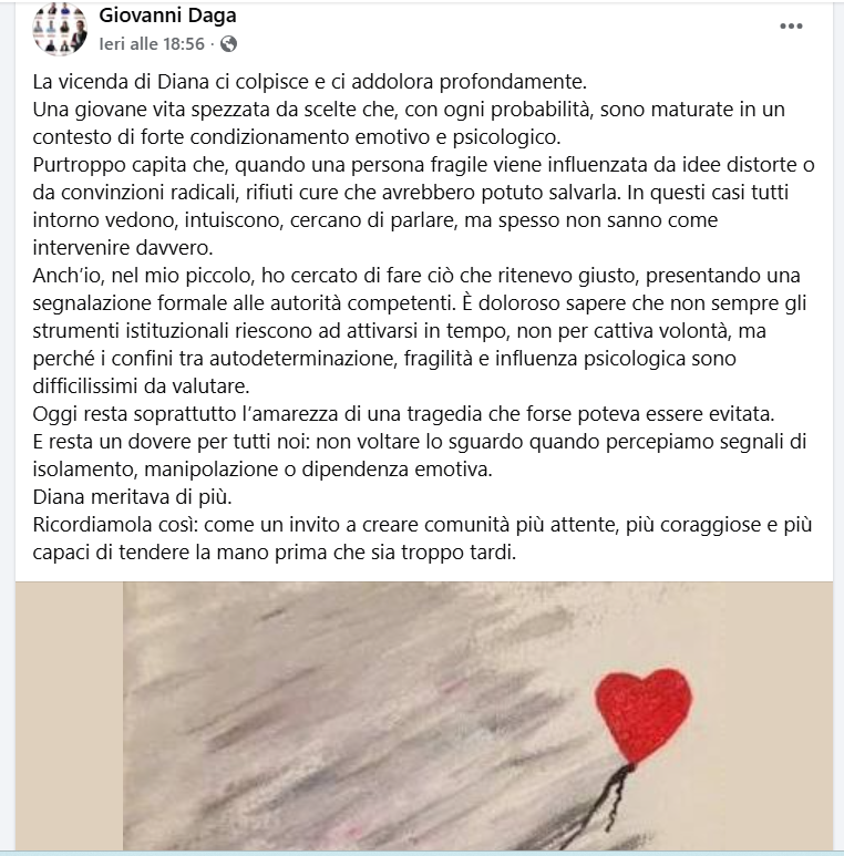 Ma Giovanni Daga, il primo cittadino di Nuragus, dopo un post pubblico sui social nel quale riconosce il dolore per una giovane vita spezzata e scrive parole molto nette: "Una giovane vista spezzata da scelte che, con ogni probabilità, sono maturate in un contesto di forte condizionamento emotivo e psicologico. Purtroppo capita che, quando una persona fragile viene influenzata da idee distorte o da convinzioni radicali, rifiuti cure che avrebbero potuto salvarla. In questi casi tutti intorno vedono, intuiscono, cercano di parlare, ma spesso non sanno come intervenire davvero. Diana meritava di più".