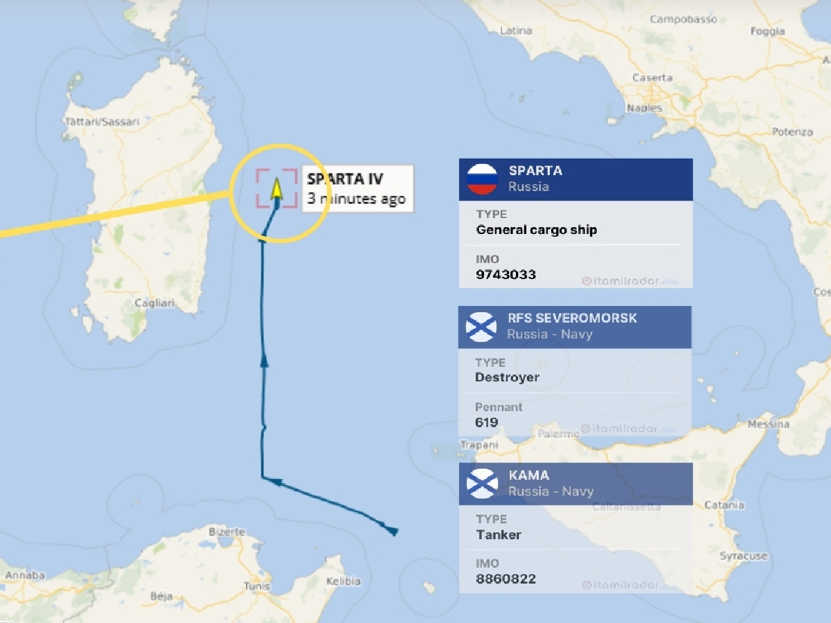 Da alcuni giorni una flottiglia della Marina russa composta dal cacciatorpediniere Severomorsk, dalla petroliera Kama e dal cargo Sparta IV staziona davanti alle coste della Sardegna, in acque internazionali. Lāunica imbarcazione tracciabile con il trasponder acceso resta la Sparta IV, i cui spostamenti hanno seguito rotte dal largo della Sicilia, verso le Baleari e poi davanti allāisola, come riportato dal sito Itamilradar.