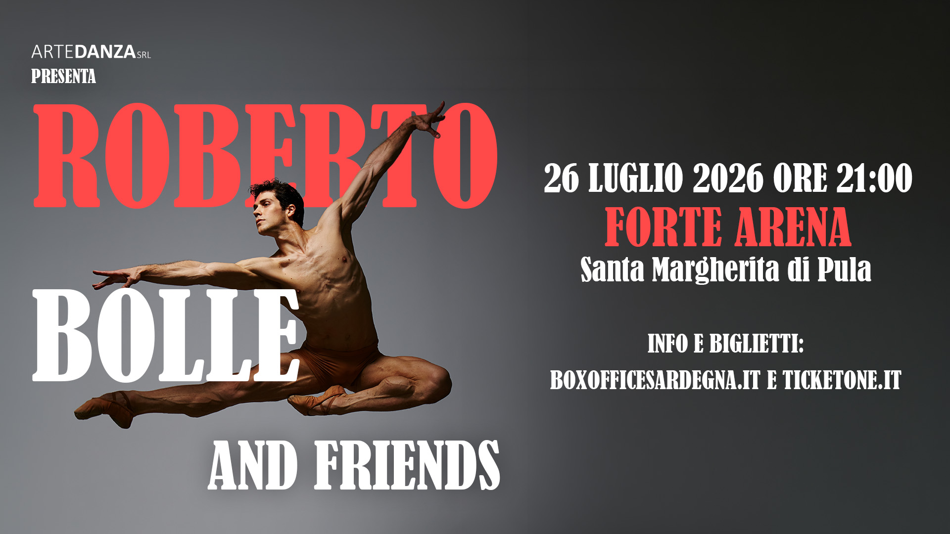 Il Teatro sotto le stelle del Forte Village a Santa Margherita di Pula ospiterà sul proprio palco uno degli appuntamenti più attesi della danza internazionale: il GalaRoberto Bolle and Friends, prodotto da ARTE DANZA srl,in programma domenica 26 Luglio alle ore 21:00.